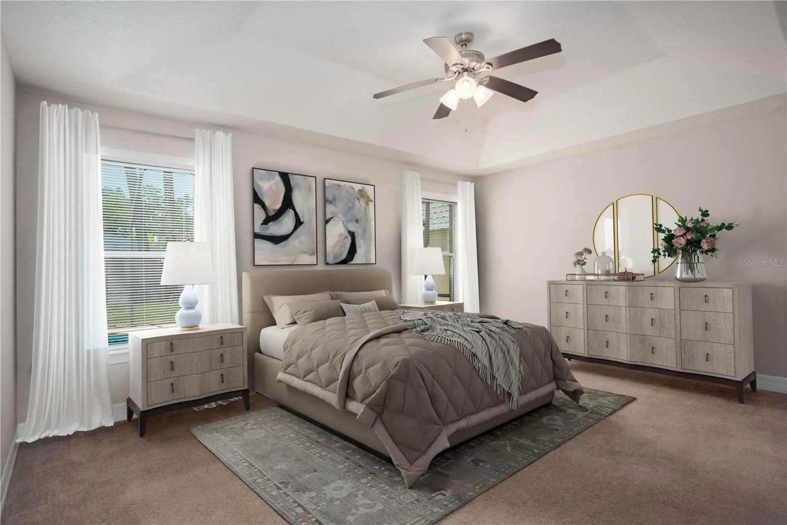 Retreat to the luxurious primary suite, where tray ceilings and ample natural light create a relaxing haven. The en-suite bathroom offers a soaking tub, separate shower, dual vanity, and a walk-in closet. The split floor plan provides privacy, with two additional bedrooms and a full bathroom with a shower/tub combo on the other side of the home.\r\n