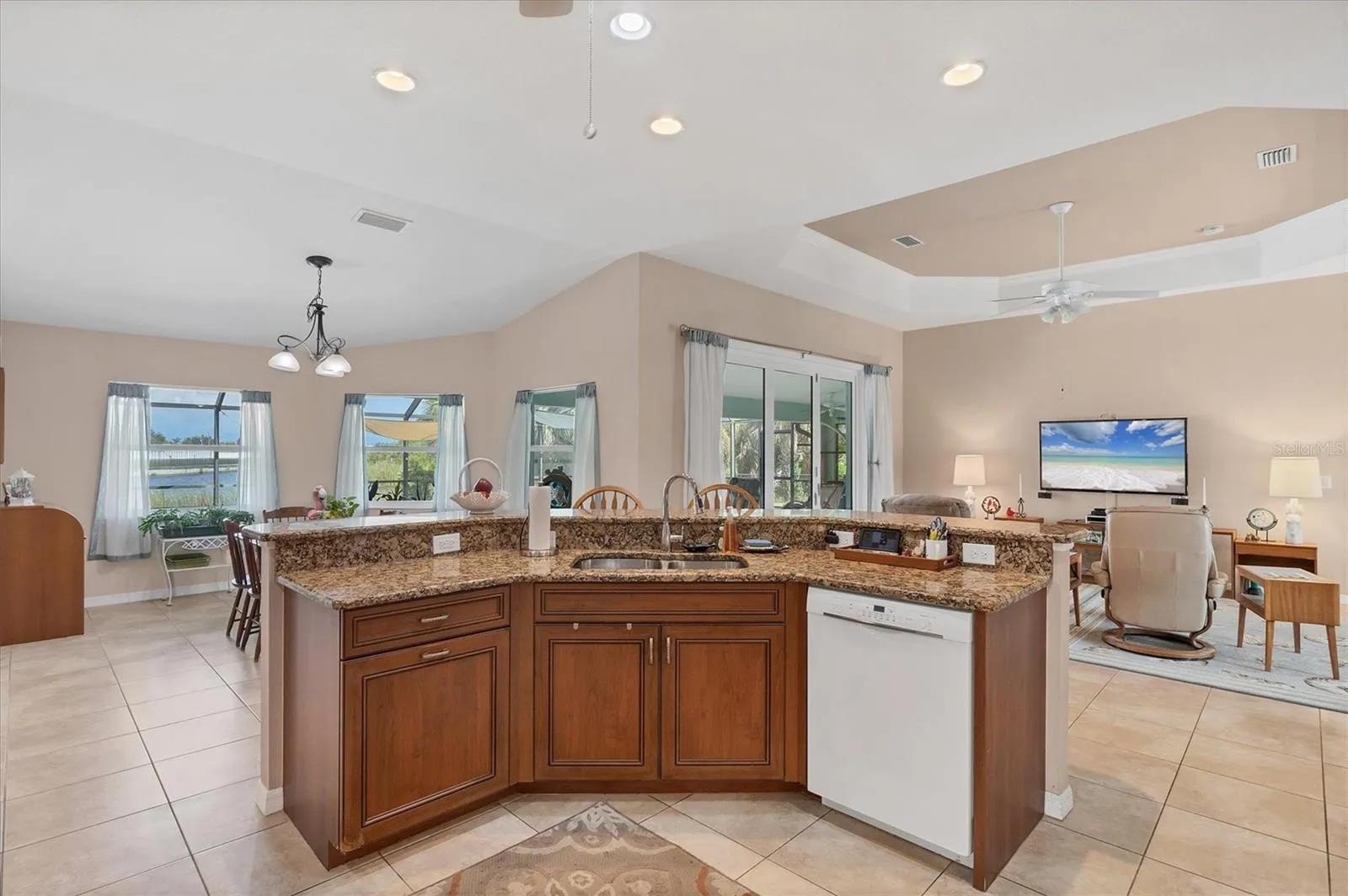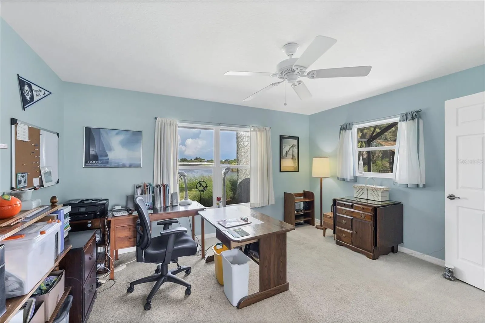 • Impressive chef’s kitchen features expansive granite countertops, abundant custom cabinetry, and a large breakfast bar overlooking stunning water views • 5x10 walk-in pantry • Office with custom built-in shelving – work in comfort and style\r\n