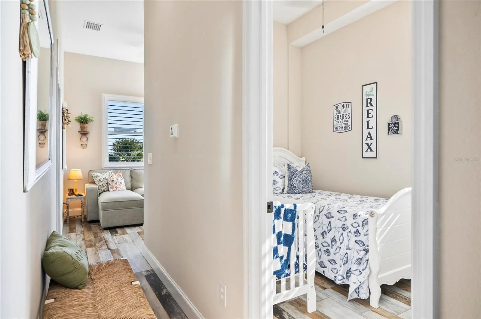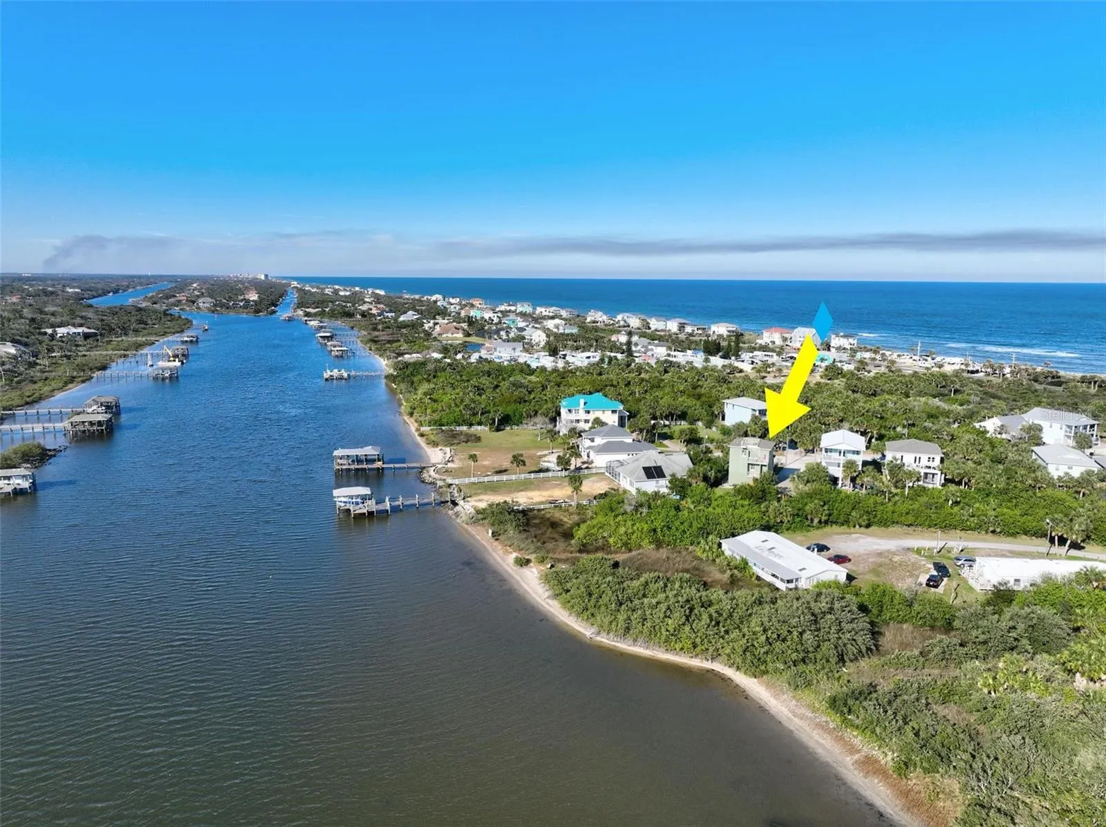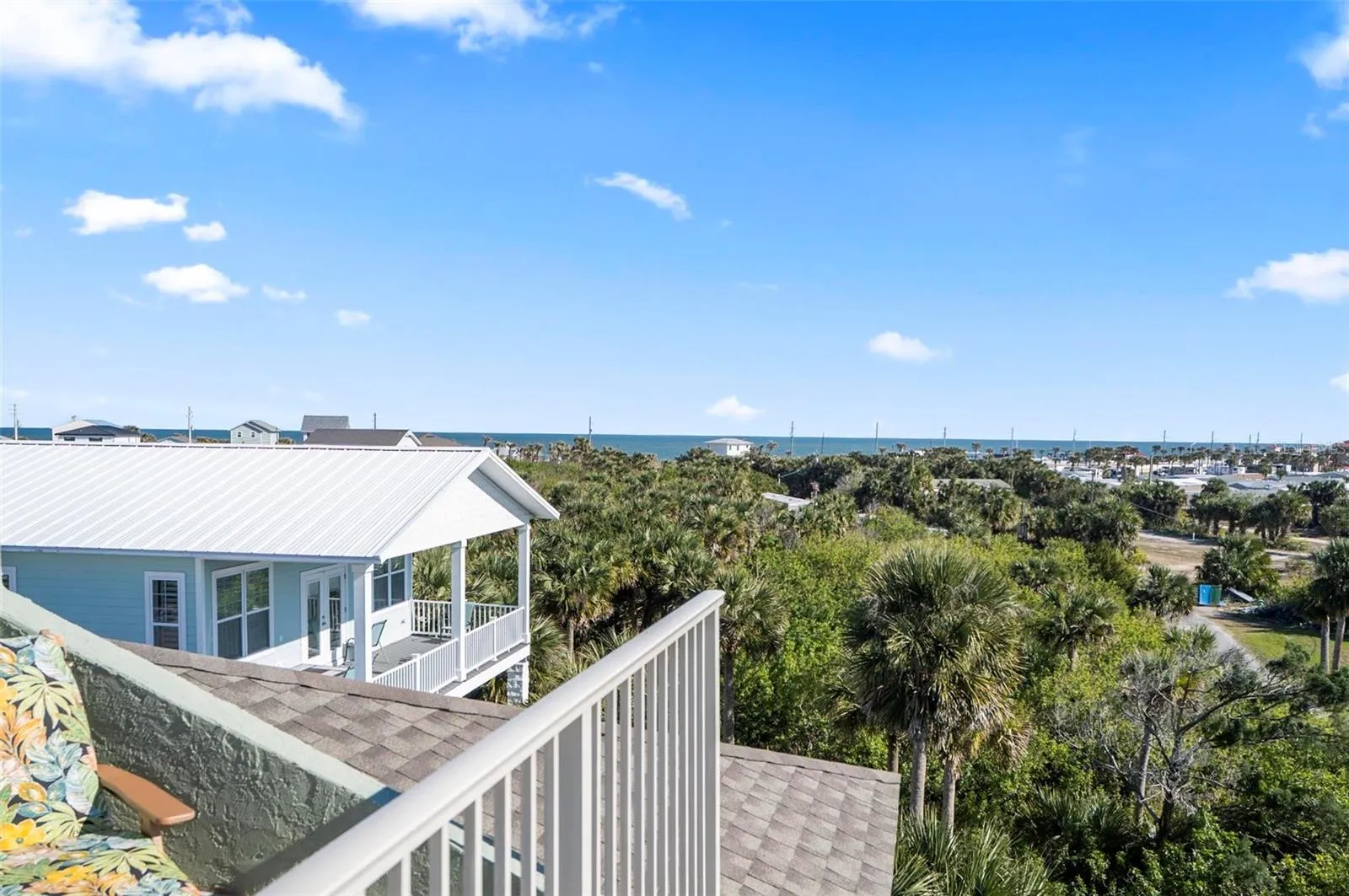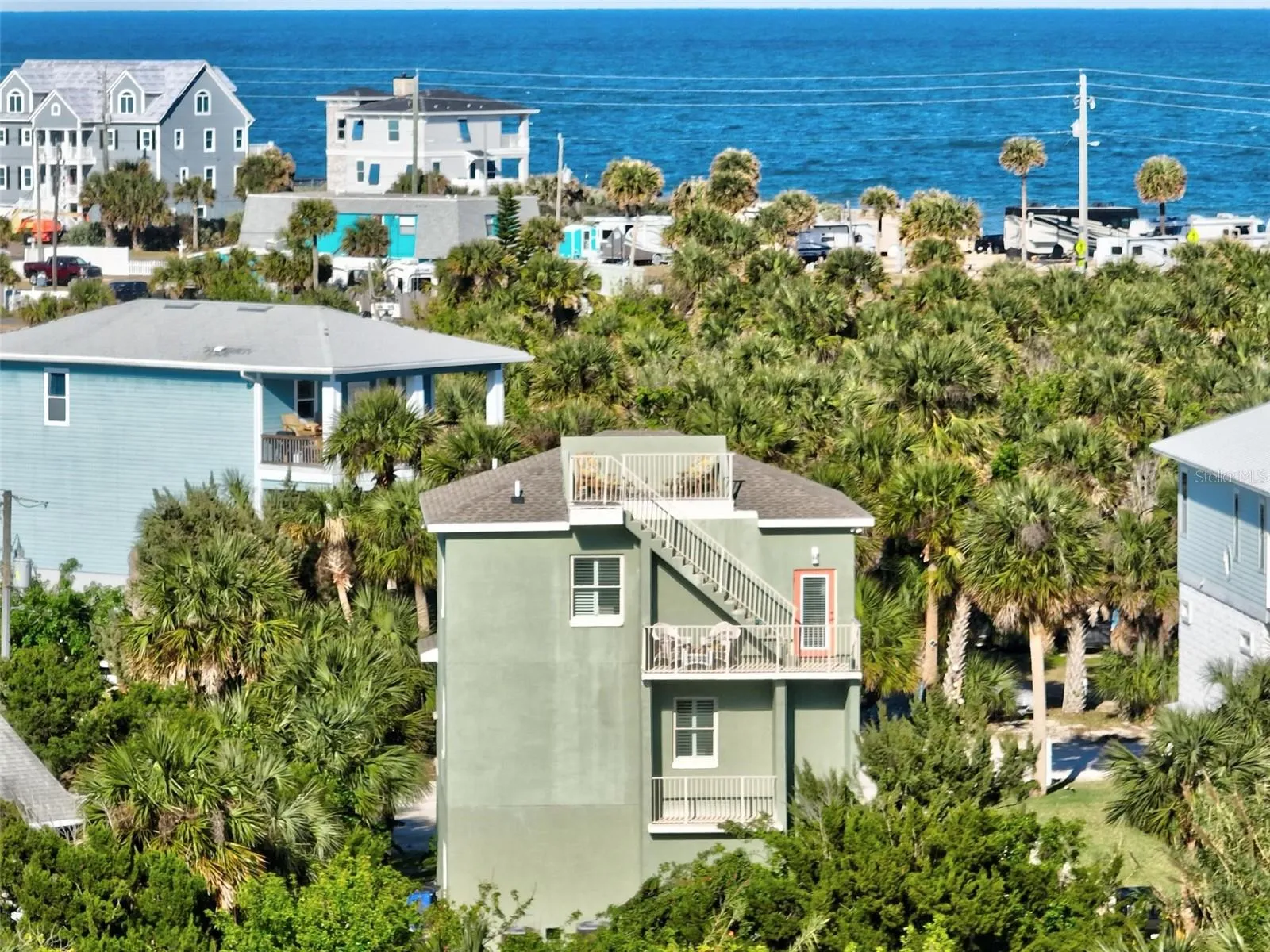 +"PublicRemarks": "Coastal design meets modern construction all in walking distance to the beach with a deeded beach access. Built in 2021 with eight inch concrete walls, cement board soffits, a large solid concrete safe room with eight inch thick concrete ceiling. Oversized foundation footers, all exterior steps are concrete, the roof top patio is concrete. Elevator shafts are in place and insulated and wired. When first walking up to the home you are greeted with a cozy front porch. As you enter the main level of the home which is the second story from the ground you have the living room and kitchen. The kitchen has high-end cafe' appliances, and there is a walk in pantry. Off the living room is one of the two primary bedrooms with an ensuite. Going up stairs you have the main primary with an ensuite, a sitting room, and a third bedroom. From this level you access the stunning roof top patio to take in the 360 degree views of the intracoastal and the Atlantic Ocean. From the main level of the home you will access the downstairs ground level which has the safe room with a small kitchenette that is being used a bedroom, storage and garage access. Beautiful engineered Luxury laminate floors, plantation shutters, and coastal charm exudes throughout this home. Located minutes from downtown flagler beach with shops, and restaurants. Major highways can be accessed in 15 minutes making commuting easy."