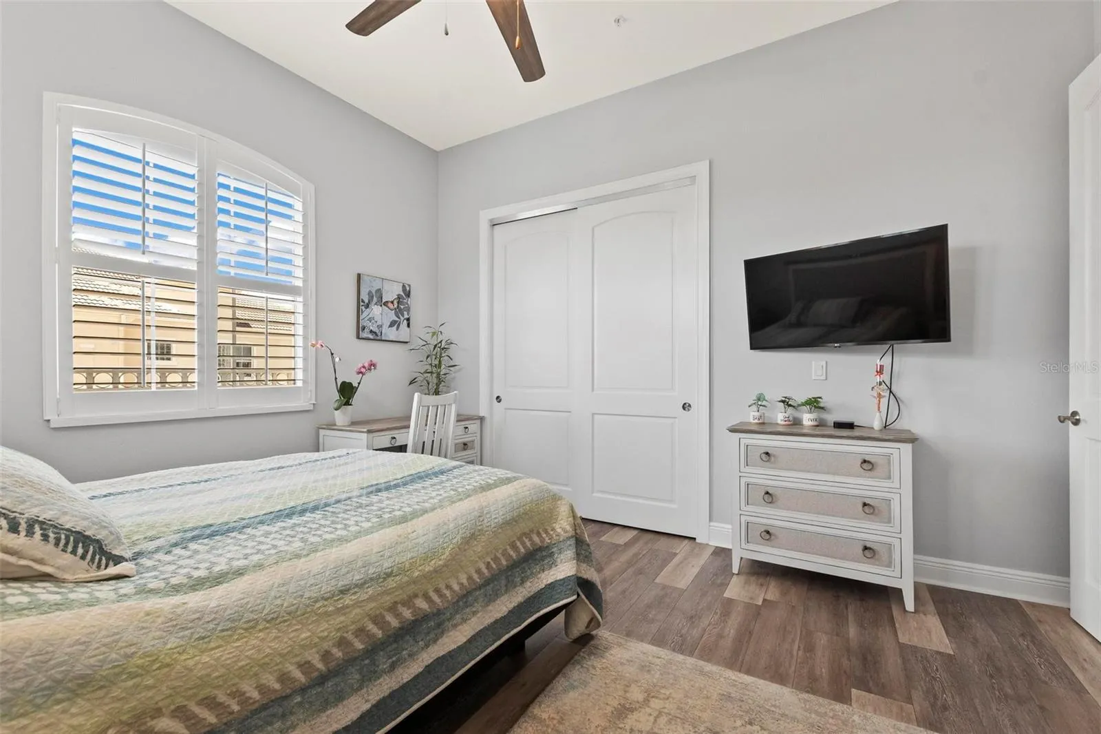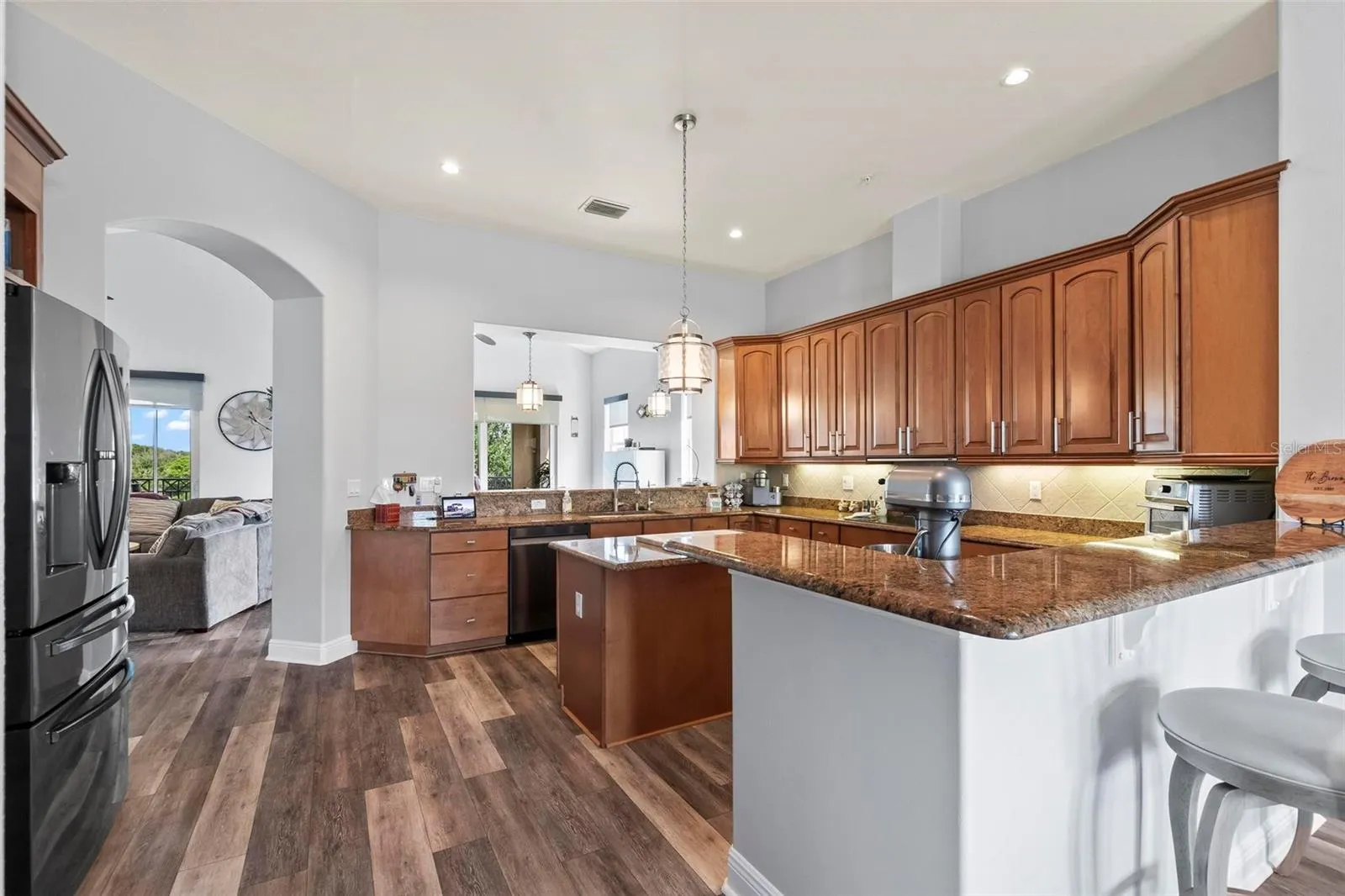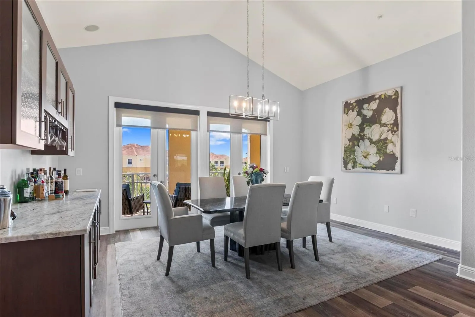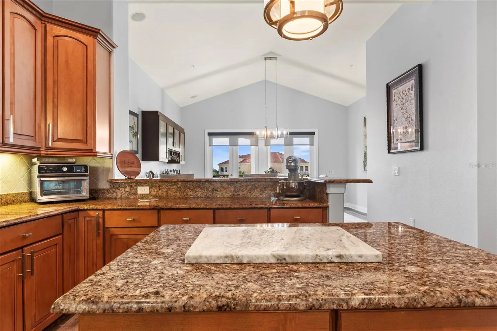 Luxury renovations include remote control shades in living, dining and primary bedroom. All new lighting and fans throughout. All new "finger print resistant" stainless smart appliances. Custom cabinetry in dining area, granite bar top, complete with wine chiller. LVT flooring in living areas, custom tile and cabinetry in bathrooms, large soaking tub in primary bath. Slate flooring in both front and back covered porches. Whole house water filtration system, New water heater. New quartzite poly flooring in your private two car garage.\r\n