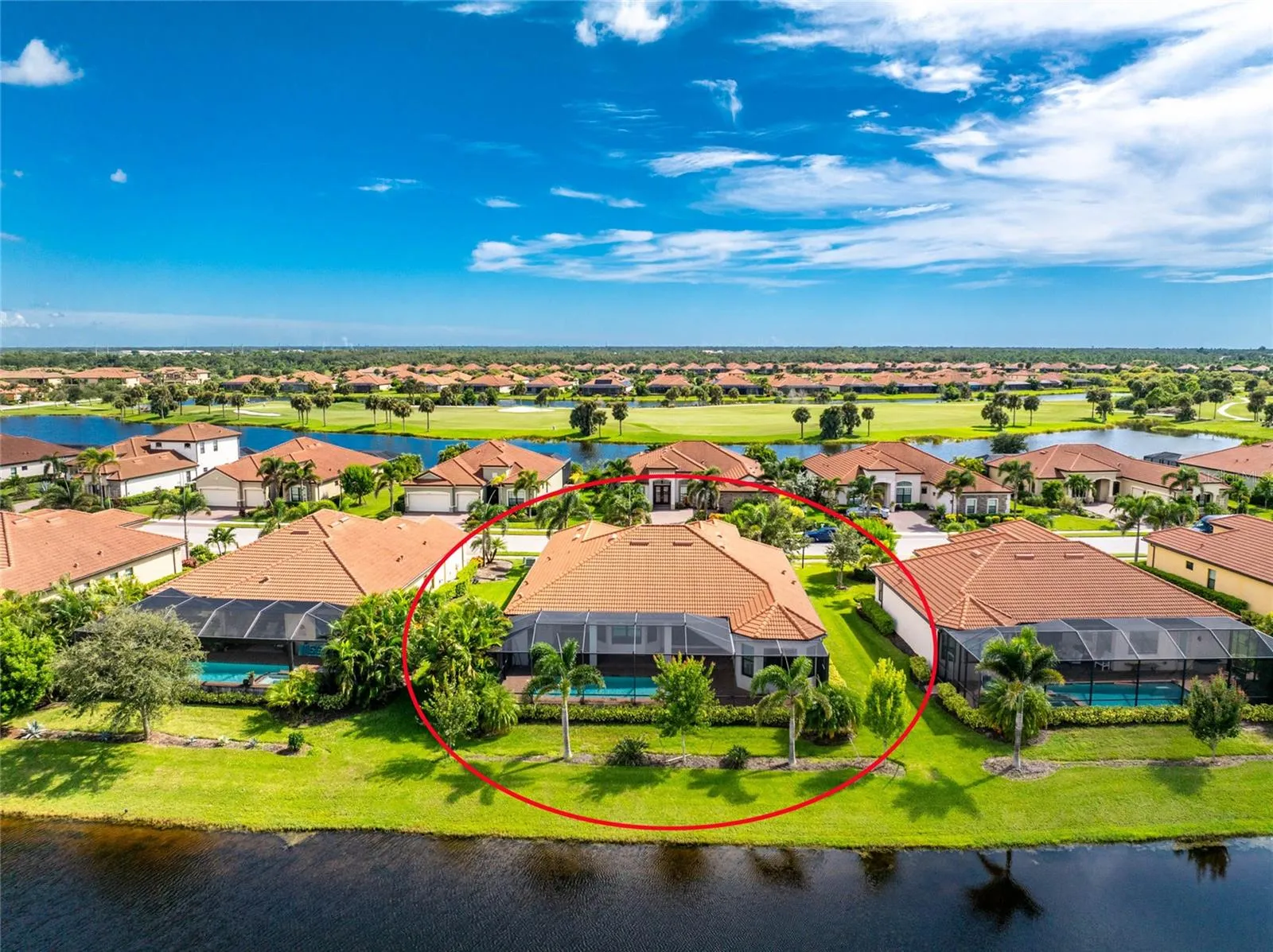 Experience Luxurious Waterfront Living in Sarasota National! Discover refined Florida living with this immaculate 2020-built Bougainvillea model home, perfectly positioned on a premium waterfront lot with sweeping golf course views. Offering 2,810 square feet of beautifully designed space, this 4-bedroom, 3-bathroom pool home includes a formal dining room, a gourmet kitchen, breakfast nook, expansive great room, and a private pool and spa—set within the prestigious gated community of Sarasota National. From the moment you arrive, the curb appeal is undeniable, with a tile roof, paver driveway, lush landscaping, and elegant architectural features. Inside, the open-concept floor plan is accentuated by tray ceilings and abundant natural light. The chef’s kitchen is a true centerpiece, featuring granite countertops, white cabinetry, stainless steel appliances, a walk-in pantry, modern lighting, and a bright breakfast area with views of the lanai and pool. The spacious great room flows seamlessly into the dining areas, creating an ideal setting for everyday living and entertaining. Retreat to the luxurious primary suite, complete with tranquil water views, dual walk-in closets, a tray ceiling, and a spa-inspired en suite bath featuring dual granite vanities, a garden tub, walk-in shower, makeup area, and crown molding. Two guest bedrooms are privately located on the opposite side of the home, one with its own en suite bath—perfect for visiting guests. A versatile den/office with a closet offers the flexibility to serve as a fourth bedroom, home gym, or creative space. Step through the expansive sliding glass doors to your private outdoor oasis. The expansive paver lanai includes two covered lounging/dining areas, a fully equipped outdoor kitchen, and a heated saltwater pool and spa with a serene waterfall feature. The second bathroom, which also serves as pool bath and a well-appointed laundry room with built-in cabinetry and sink add to the home's functionality.\r\n