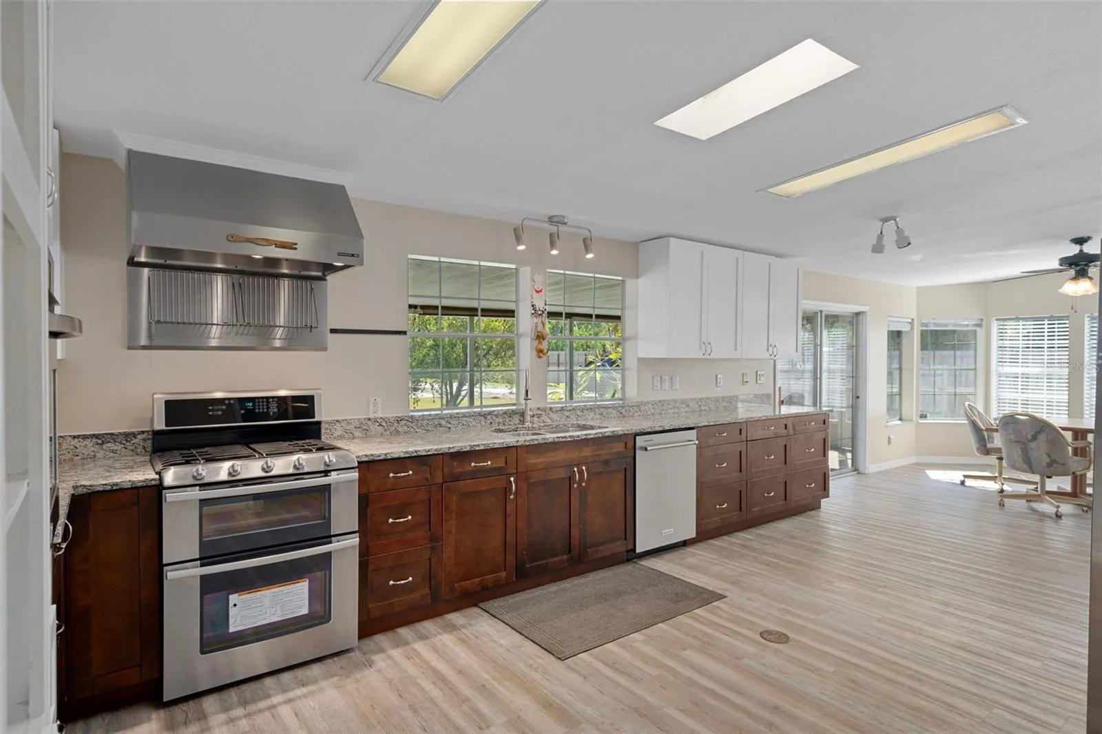 The large living room flows seamlessly into the dining area, creating an open-concept layout ideal for entertaining. The kitchen is a chef’s delight, featuring a commercial hood with a red-light warming station and a double wall oven and a regular range and ample counter space. A cozy breakfast nook leads to the screened in lanai—perfect for enjoying morning coffee or relaxing outdoors.\r\n