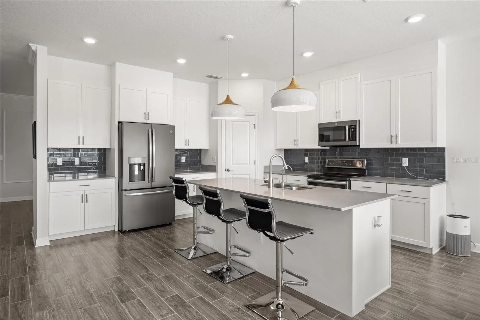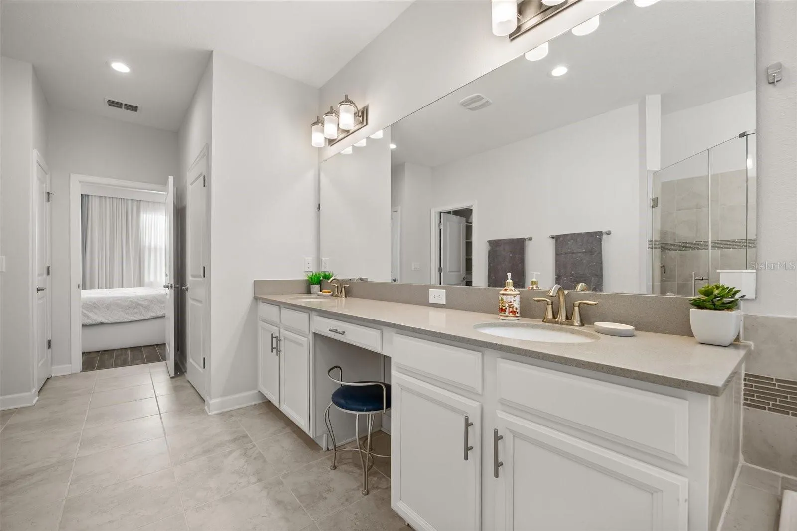 +"PublicRemarks": "Welcome to this *PROFESSIONALLY DESIGNED* single-story home, the beautiful MARINA floor plan by Lennar Homes, consisting of *4 BEDROOMS / 3 FULL BATHROOMS and 3 CAR GARAGE* nestled in a premium lot, with no neighbors in the back, located in the sought after GATED RESIDENTIAL COMMUNITY *REFLECTIONS at Storey Lake*. Upon entering this filled with natural light home, you are greeted by a spacious foyer that seamlessly flows into the home's main living areas, with 6" x 24" DARK GREY wood like CERAMIC TILE FLOORING. The 2nd and 3rd bedrooms are located on the left side of the foyer, and 3rd bedroom has been converted a suite with a full bathroom, featuring QUARTZ double vanity, and a private area for the toilet and shower. Moving into the main living areas, the formal dinning room will be on your left, tastefully designed, making it ideal for private dining experiences. The spacious open KITCHEN and FAMILY ROOM offer a modern, yet cozy ambiance with many upgraded features such as built-in cabinets, TV shelving and lighting. At the heart of the home, the kitchen boasts high-quality stainless steel appliances—including a microwave, range, side-by-side refrigerator, and dishwasher. The kitchen's GREY QUARTZ countertops and 42-inch built-in upper cabinetry reflect a perfect balance of style and functionality. The large Master Bedroom is located at the right end of the family room and offers two windows to the backyard. The Master Bathroom, designed with an eye for sophistication and practicality is equipped with quartz double vanity, bathtub and separate shower with glass enclosure. The oversized walk-in closet is equipped with high quality built-in California shelving. The 4th Bedroom, with luxury vinyl flooring is located at the right side of the living room and has the 3rd Bathroom right outside. The extra large 3 CAR GARAGE has a utility sink added. The community Clubhouse offers a beautiful pool, fully equipped gym, conference room and play area. This home is impeccably well maintained and ready to move-in. Off of Osceola Parkway, this property offers a strategic location near Disney parks, Publix, Walmart, Target and a wide selection of grocery stores, shopping, and restaurants."