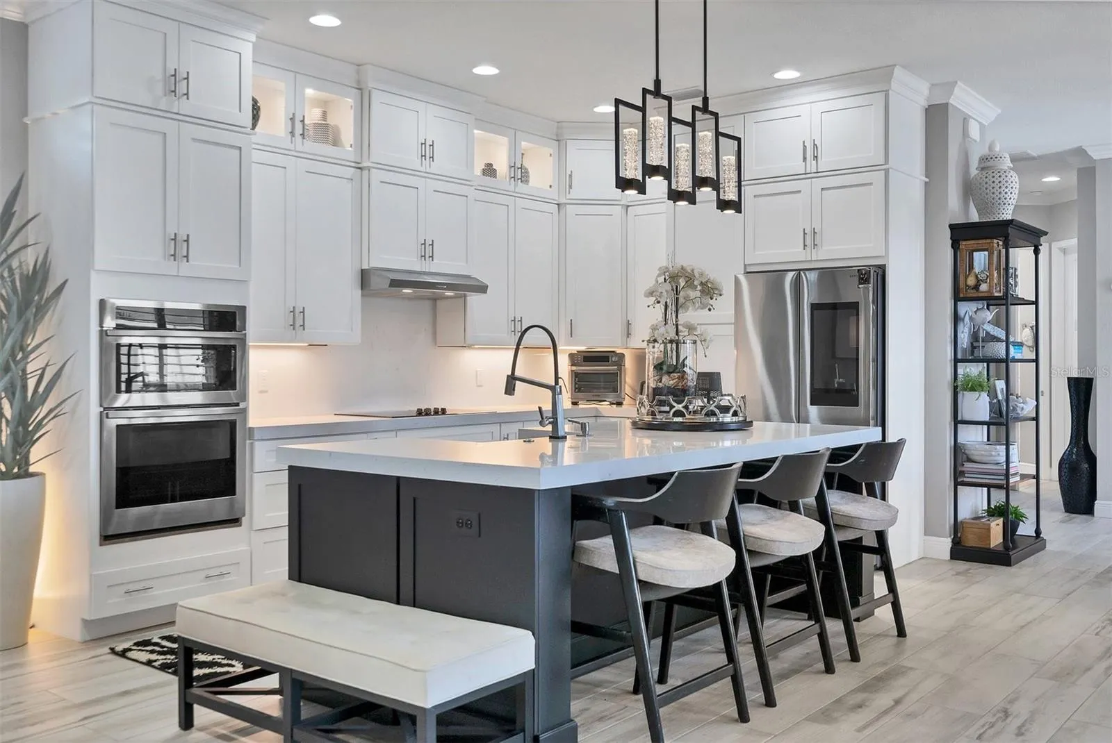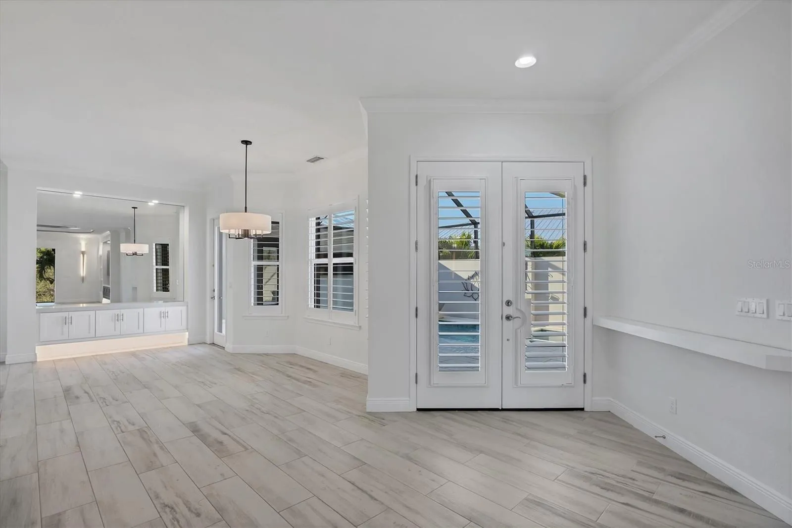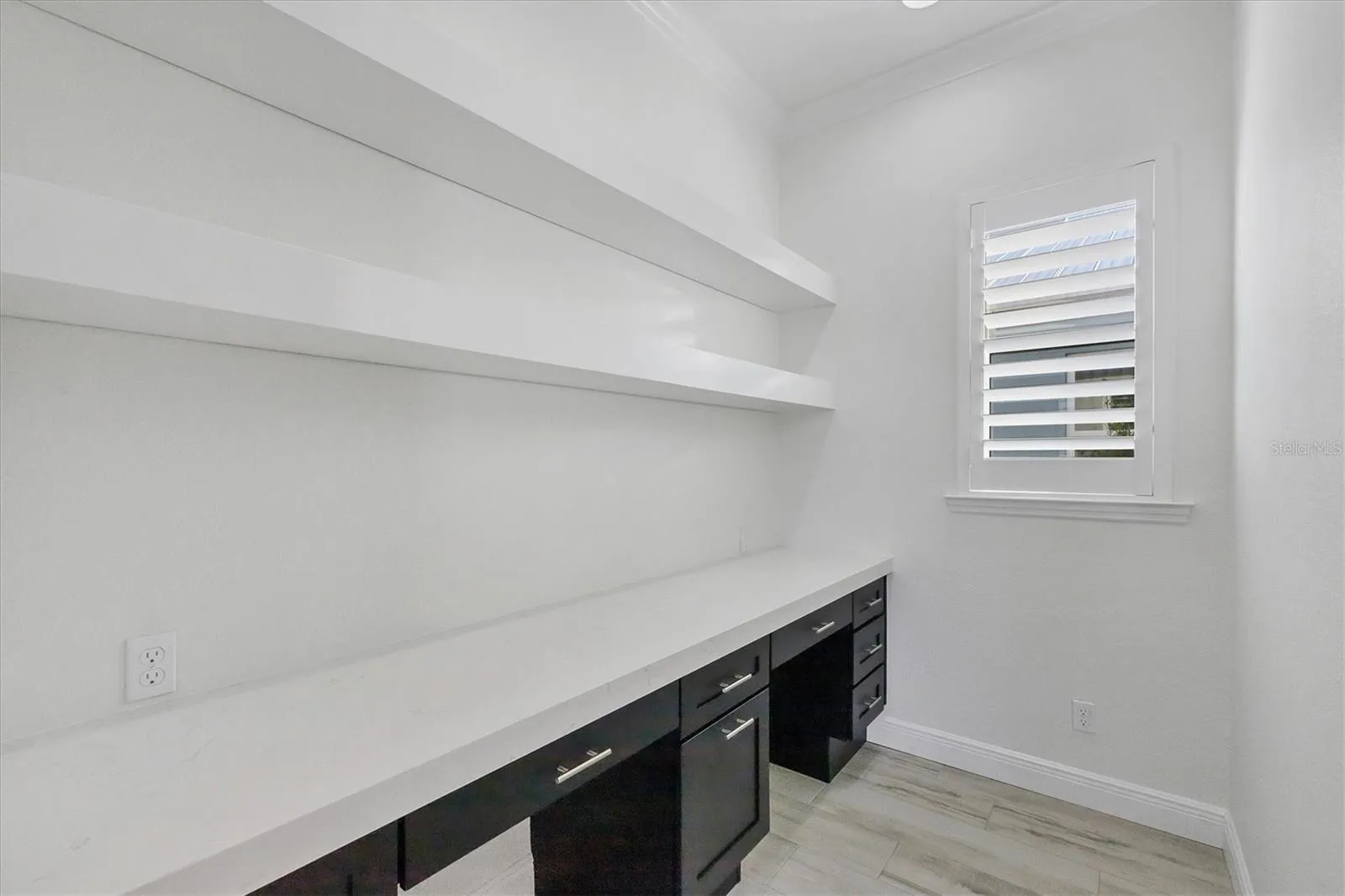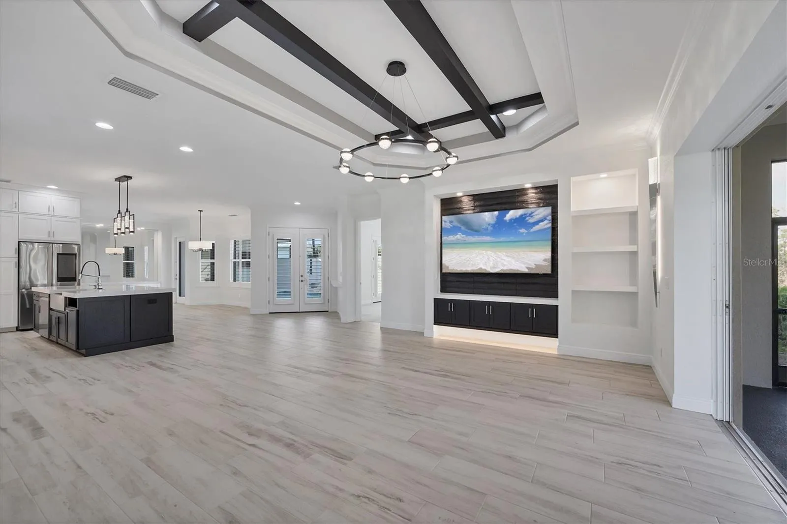 Inside, a light-filled open floor plan welcomes you with soaring tray ceilings, beams, plantation shutters, crown molding, and rich designer finishes at every turn. The gourmet kitchen is a showstopper, featuring stunning floor-to-ceiling cabinetry, marble countertops, a massive center island, premium lighting, and beautifully crafted built-ins that make this space as functional as it is beautiful. The living room has been expanded an additional four feet, offering a grander gathering space anchored by a custom entertainment wall. Even the pantry has been enlarged and converted into a flexible home office—perfect for working, crafting, or additional storage.\r\n