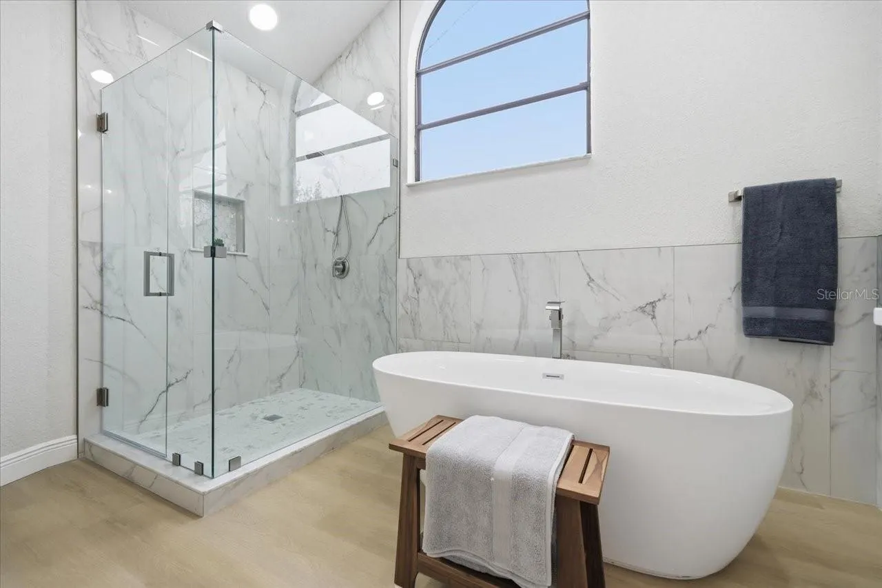 The primary suite bath is a true retreat, offering a spa-like experience with a freestanding soaking tub, double vanity, modern fixtures, and a walk-in shower, all designed to evoke a sense of relaxation and understated luxury.\r\n