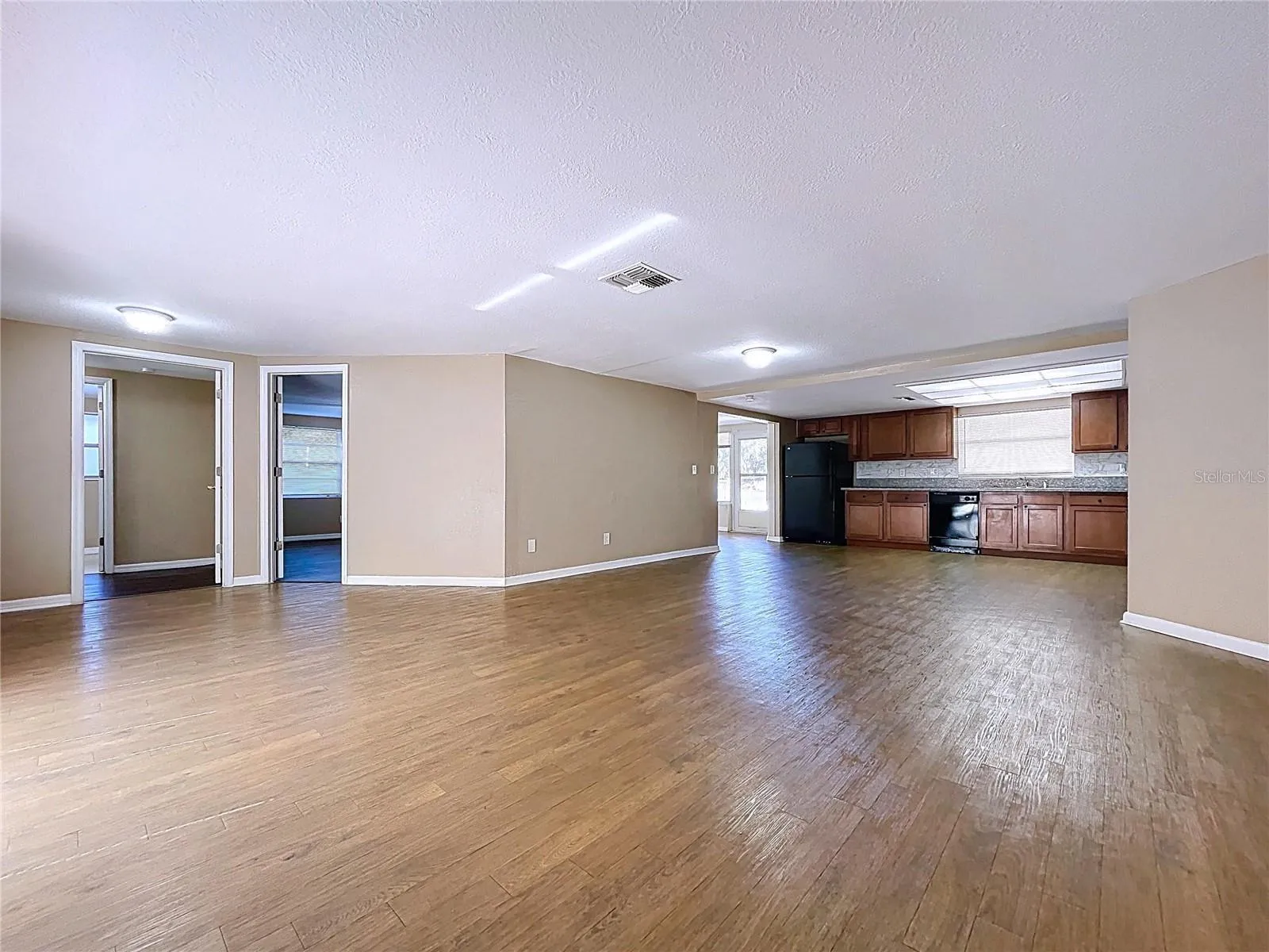 +"PublicRemarks": "Welcome to your dream home! This move-in ready gem offers 3 spacious bedrooms, 2 full bathrooms, and a 2-car garage—all nestled on a serene waterfront lot with no rear neighbors and NO HOA or CDD fees! Step through the front door into a bright and open great room. The updated kitchen features granite counters, black appliances and real wood cabinets. The split floor plan provides privacy and comfort, with one large bedroom with walk-in closet, full bath and laundry room on one side, while the spacious primary suite is tucked away on the other with its own private bath. Entertain with ease in the large great room off the kitchen, or step outside to your own personal oasis overlooking a tranquil pond. It’s the ideal setting for relaxing evenings or weekend get-togethers with friends and family. This home checks all the boxes—style, space, updates, and location. Don’t miss your chance to make it yours!"