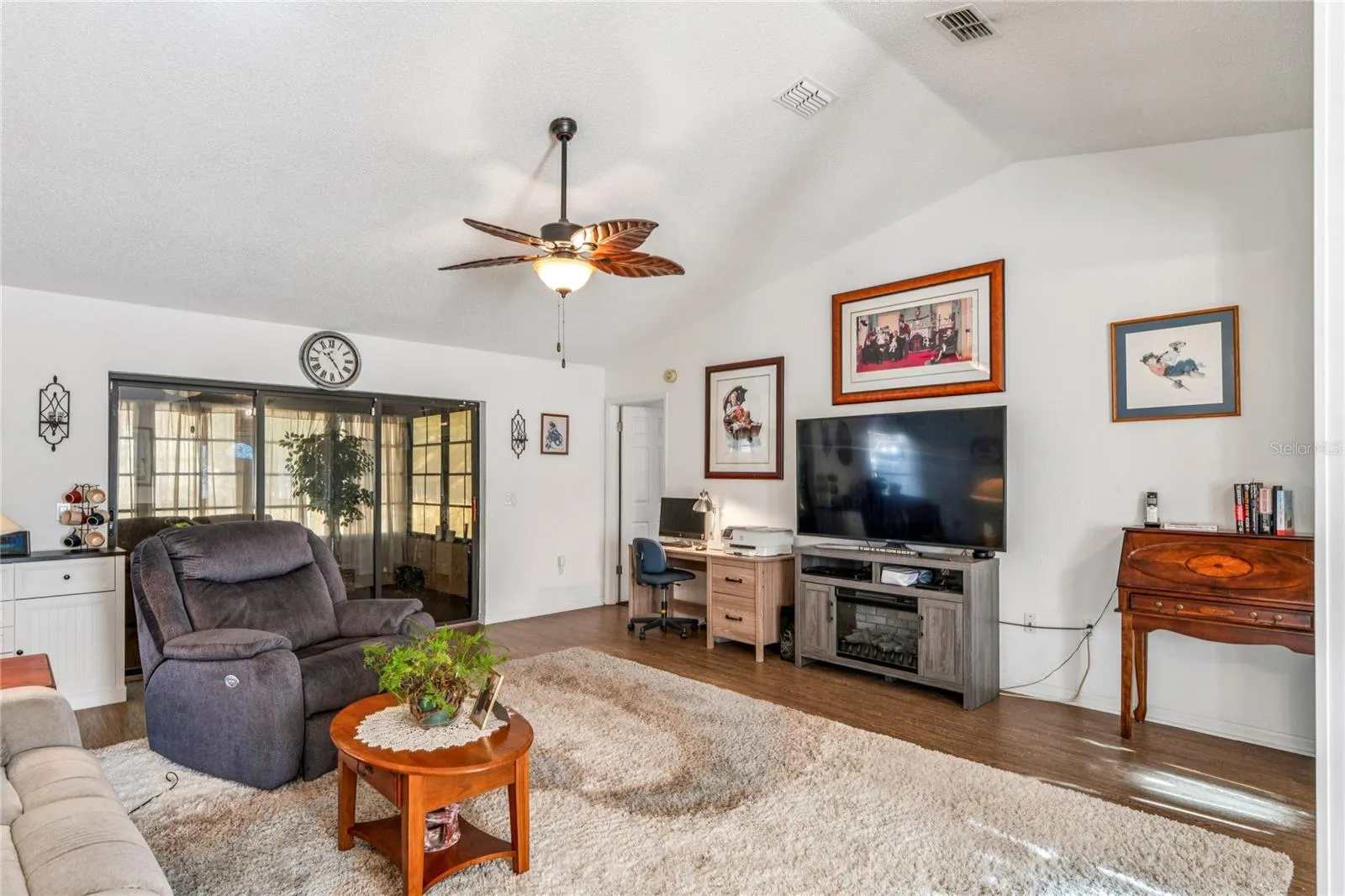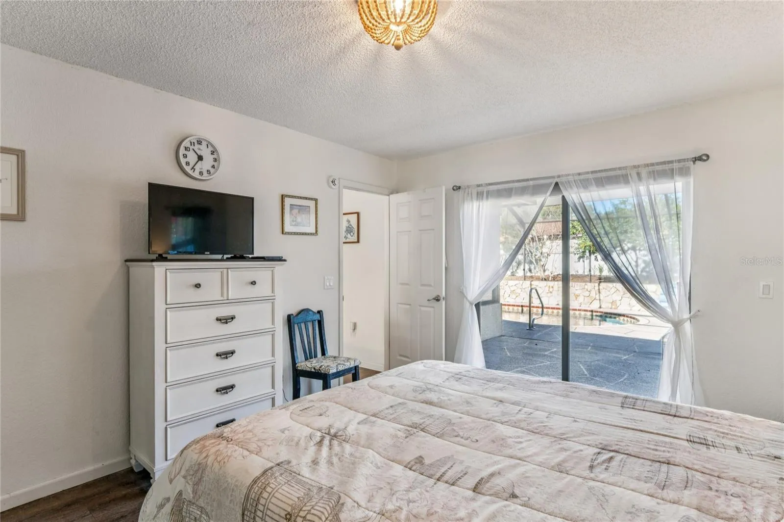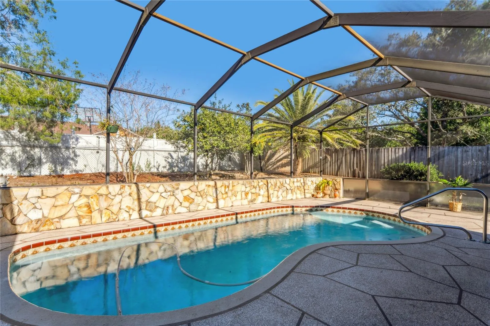 Large screened-in lanai with vinyl windows for year-round enjoyment. Resurfaced heated/cooled saltwater pool (2021) with updated screening. Energy-efficient variable-speed pool pump. Fenced backyard for privacy and pets. AC replaced in 2018. Some furnishings available for purchase.