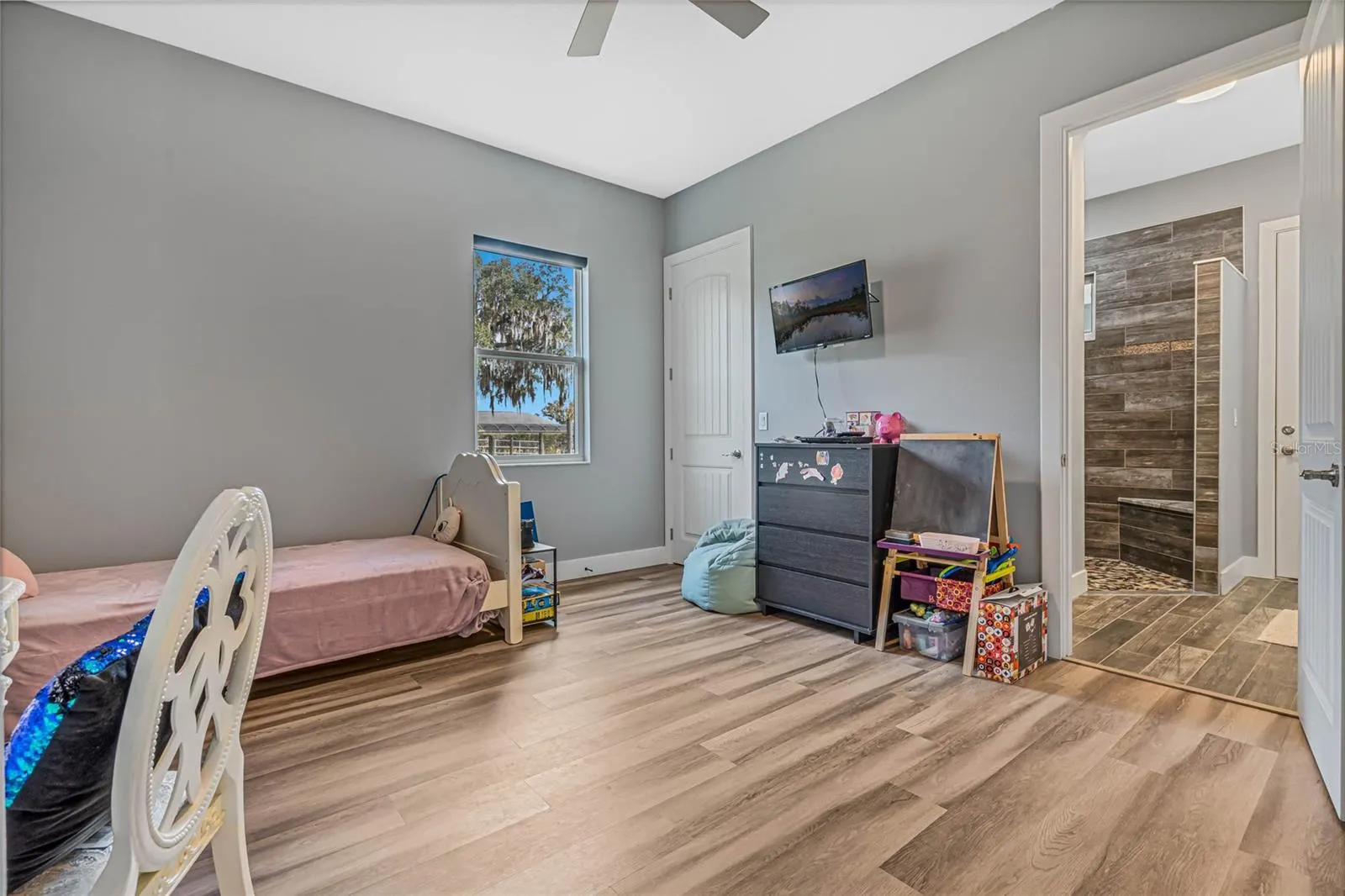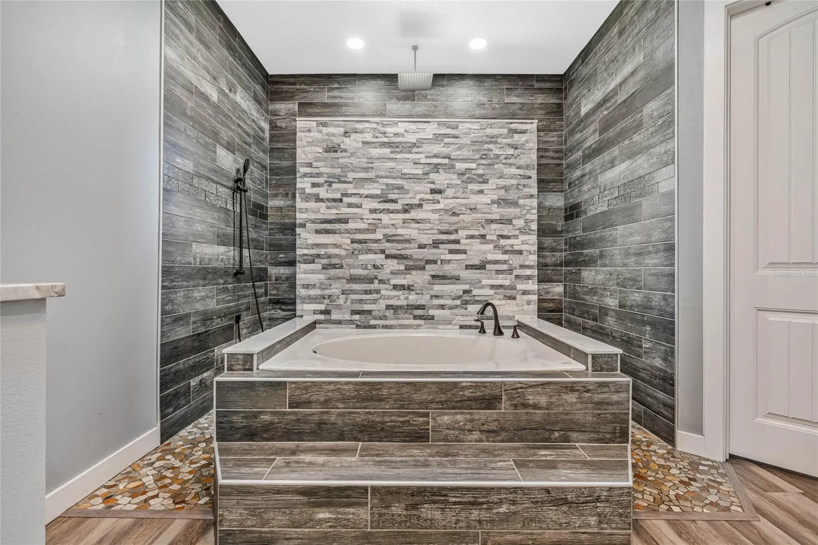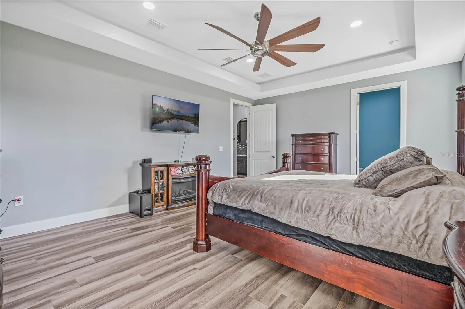 Masterful Retreat: A large master bedroom with his and her closets and a custom walk-around shower with dual shower heads, a wand, and a rain option provide a spa-like escape.\r\n