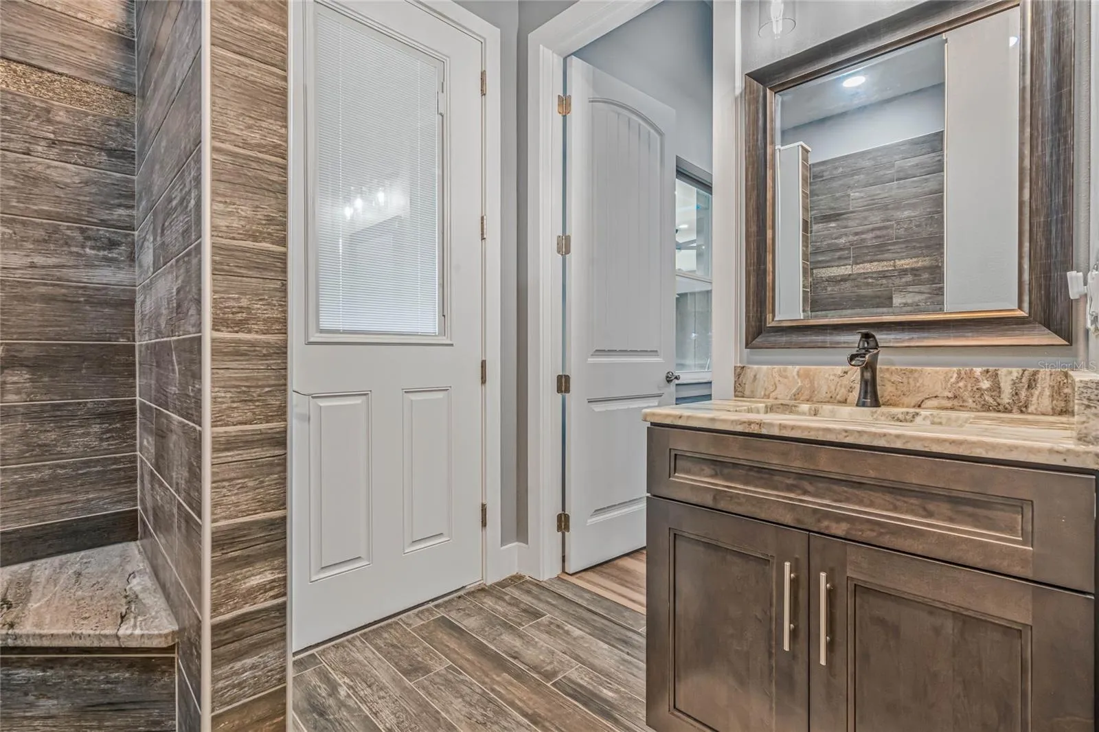 Entertainment Oasis: A 45x15 screened-in back porch with a custom entertainment center featuring an electric fireplace provides the perfect setting for gatherings.\r\n